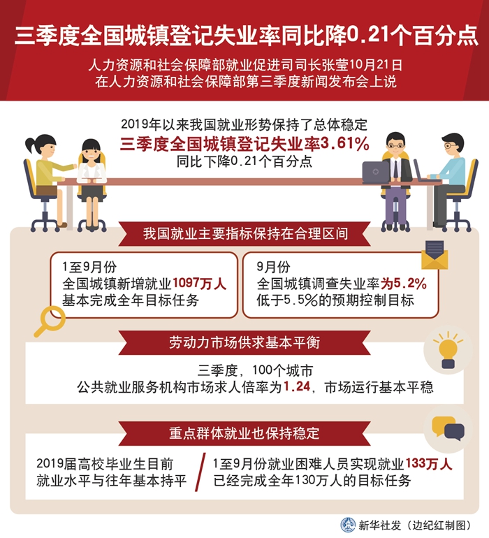 新華社北京10月21日電(記者王優(yōu)玲)人力資源和社會保障部就業(yè)促進(jìn)司司長張瑩21日說,今年以來我國就業(yè)形勢保持了總體穩(wěn)定,三季度全國城鎮(zhèn)登記失業(yè)率3.61%,同比下降0.21個百分點。