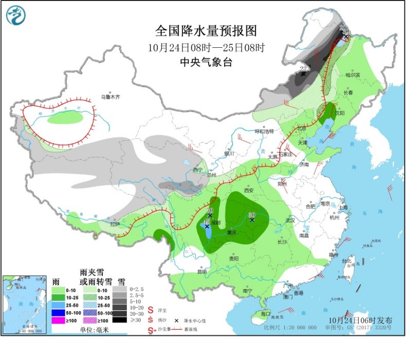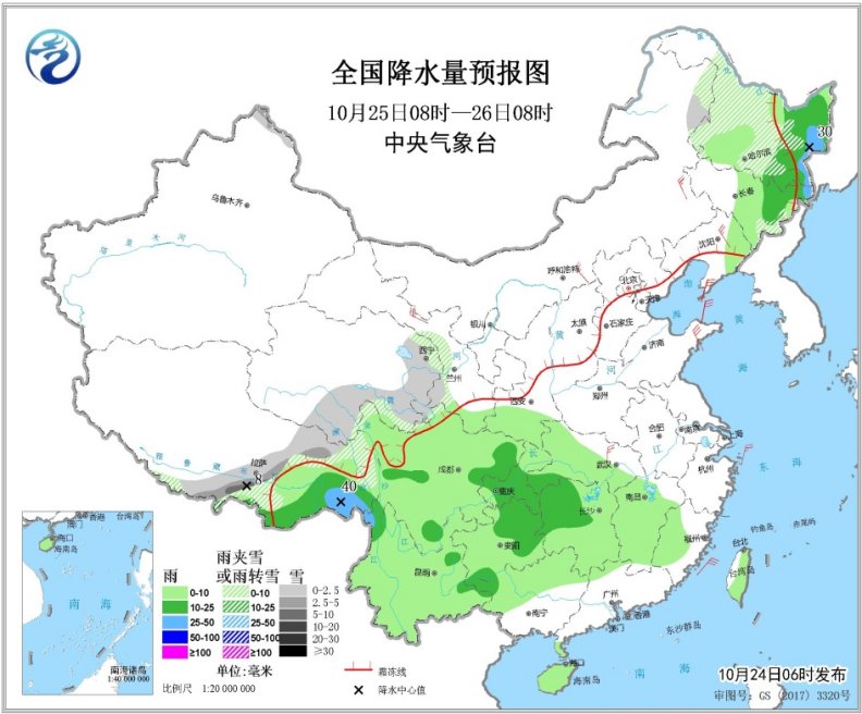 10月25日08時(shí)至26日08時(shí),內(nèi)蒙古東北部、黑龍江中部、西藏東北部和南部、青海東部和南部、甘肅河西等地的部分地區(qū)有小到中雪或雨夾雪,其中西藏南部局地有大雪。東北地區(qū)東部、西藏東南部、四川盆地中東部、湖南西部、貴州等地的部分地區(qū)有中雨,局地有大雨(25~40毫米)。
