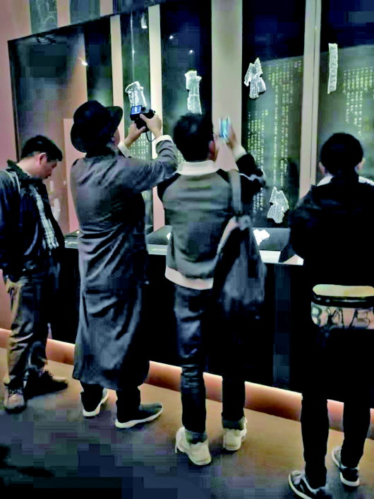 開幕是在工作日的下午,記者竟在展廳里看到人流如織——從牽著幼兒的母親到耄耋老者,無一不滿眼欣喜,或駐足研究或?yàn)g覽拍照,其中不乏著古裝與民國造型者,在幽靜的展廳中與展品融為有機(jī)的一體。中國文字協(xié)會(huì)會(huì)長(zhǎng)、清華大學(xué)教授黃德寬現(xiàn)場(chǎng)接受采訪時(shí),觀眾也圍了一圈又一圈,在記者們提問之間不時(shí)拋出自己的問題,讓黃教授嘖嘖稱嘆。