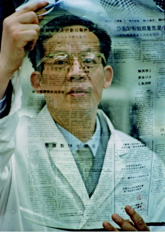 王選正在查看用激光照排系統(tǒng)輸出的報(bào)紙膠片(1991年攝)。
