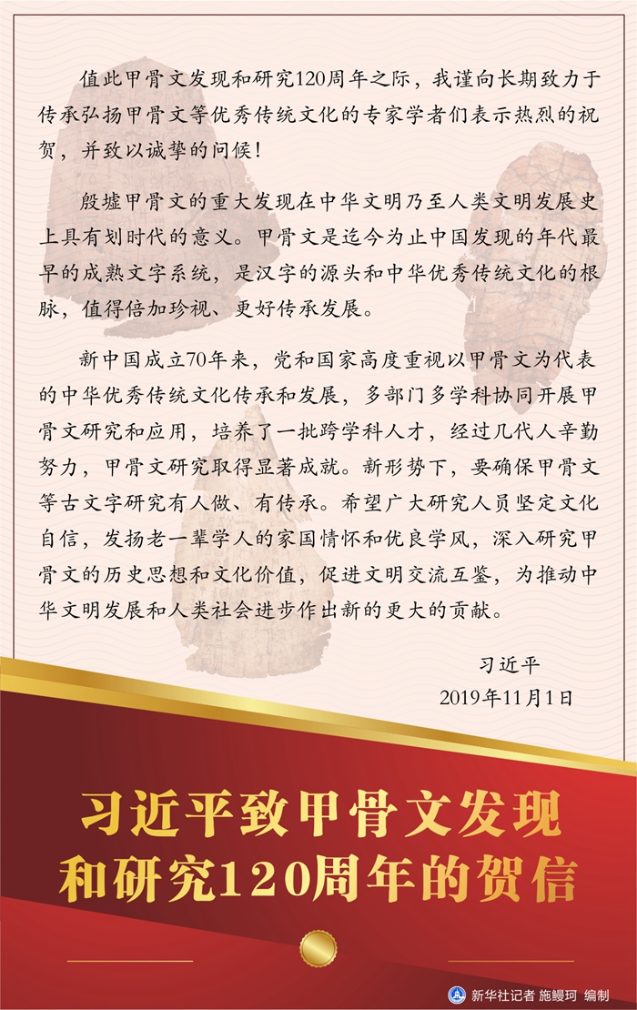 習近平致甲骨文發(fā)現(xiàn)和研究120周年的賀信 新華社記者 施鰻珂 編制