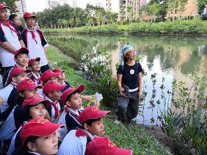 海南松鼠學(xué)堂創(chuàng)始人高高老師帶領(lǐng)??谄咧械膶W(xué)生觀察濕地的生態(tài)環(huán)境