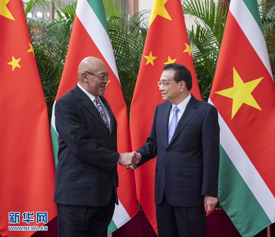 11月27日,國務院總理李克強在北京人民大會堂會見來華進行國事訪問的蘇里南總統(tǒng)鮑特瑟。 新華社記者 李學仁 攝