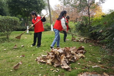 學(xué)生清掃綠地里的樹葉