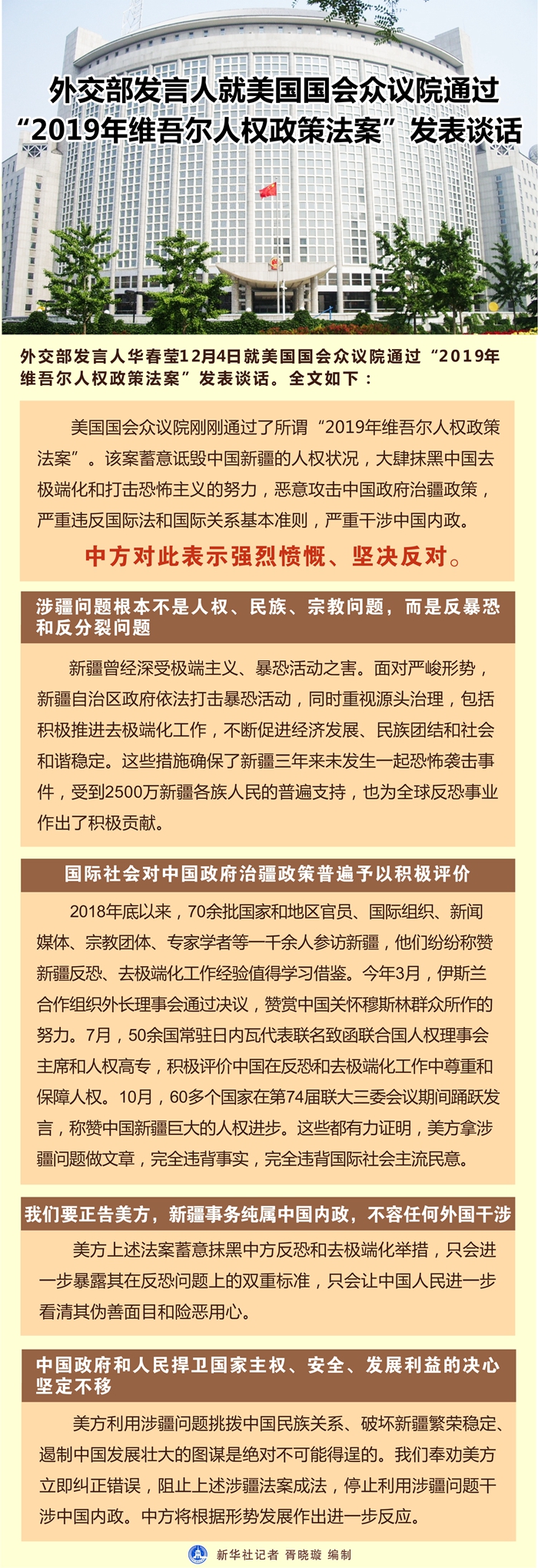 新華社北京12月4日電 外交部發(fā)言人華春瑩4日就美國國會眾議院通過“2019年維吾爾人權(quán)政策法案”發(fā)表談話。全文如下: