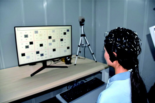 在天津大學某實驗室內,一塊布滿字符和符號的屏幕上,黑色方塊頻繁閃爍。一名男生佩戴著布滿靈敏電極的黑色腦電極帽,緊盯屏幕,在無需雙手操作的情況下,通過“意念”“隔空打字”,將字符輸入指定區(qū)域。
