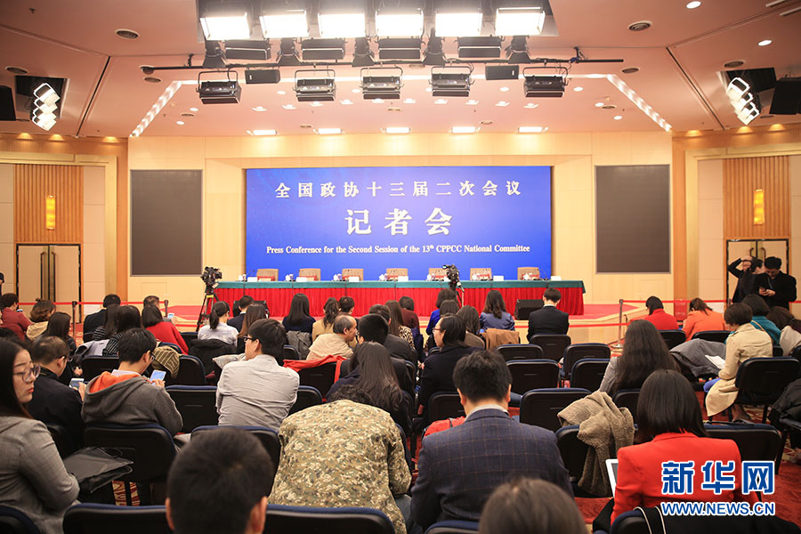全國政協(xié)十三屆二次會議3月5日15:00在梅地亞中心多功能廳舉行記者會,邀請5位全國政協(xié)委員就“打贏防范化解重大風(fēng)險、精準(zhǔn)脫貧、污染防治三大攻堅戰(zhàn)”回答記者提問。圖為記者會現(xiàn)場。新華網(wǎng)/中國政府網(wǎng) 陳杰 攝