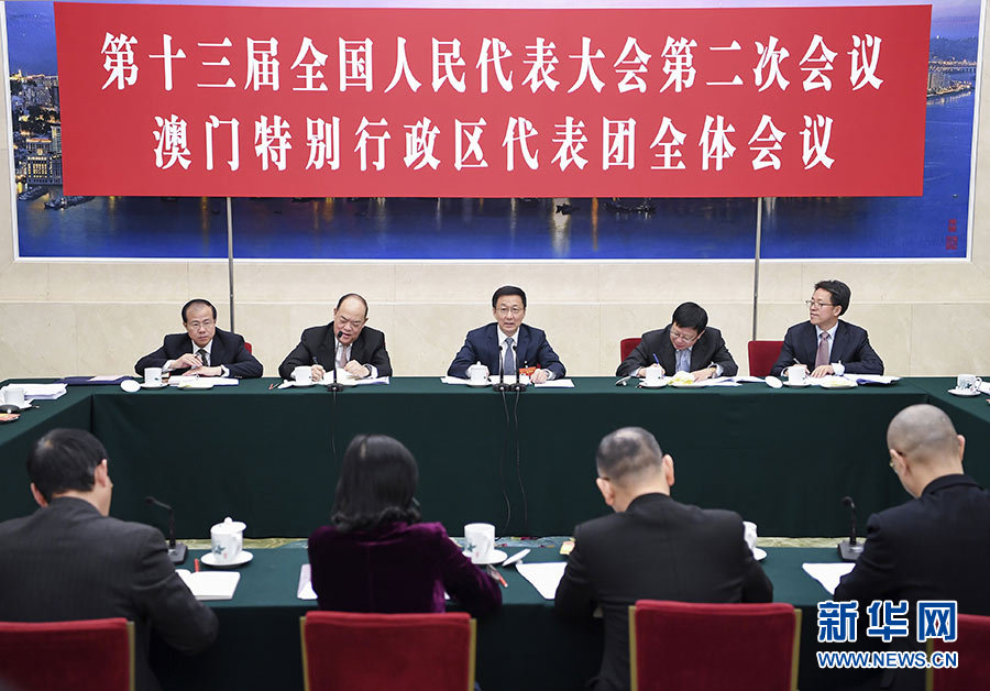 韓正分別參加了香港代表團(tuán)、澳門代表團(tuán)審議。韓正與香港、澳門地區(qū)全國人大代表進(jìn)行了親切交流。在充分肯定港澳發(fā)展取得的成績后,韓正指出,粵港澳大灣區(qū)建設(shè)的一個重要戰(zhàn)略考量,是推進(jìn)“一國兩制”事業(yè)發(fā)展,保持香港、澳門長期繁榮穩(wěn)定。香港、澳門要發(fā)揮獨特優(yōu)勢,積極參與粵港澳大灣區(qū)建設(shè),在融入國家發(fā)展大局中實現(xiàn)自身更好發(fā)展。港澳地區(qū)全國人大代表是愛國愛港、愛國愛澳的中堅力量,要進(jìn)一步發(fā)揮好雙重積極作用,為“一國兩制”事業(yè)作出新的貢獻(xiàn)。在香港代表團(tuán),韓正表示,香港在大灣區(qū)建設(shè)中作用特殊,將支持香港打造國際創(chuàng)新科技中心,鼓勵香港同胞特別是青年在大灣區(qū)創(chuàng)業(yè)就業(yè),更好發(fā)揮香港專業(yè)服務(wù)在大灣區(qū)建設(shè)中的作用。希望香港地區(qū)全國人大代表帶頭維護(hù)“一國兩制”和憲法基本法權(quán)威,帶頭支持行政長官和特區(qū)政府依法施政,帶頭促進(jìn)香港社會在愛國愛港旗幟下的大團(tuán)結(jié),帶頭參與香港與內(nèi)地的交流合作。在澳門代表團(tuán),韓正表示,大灣區(qū)建設(shè)給澳門帶來了新機遇,將支持澳門拓展發(fā)展新空間,建設(shè)“一個中心”“一個平臺”,加快發(fā)展旅游、會展等產(chǎn)業(yè),做好保障和改善民生工作,讓澳門居民在大灣區(qū)建設(shè)中得到更多實惠。希望澳門地區(qū)全國人大代表積極參與慶祝澳門回歸祖國20周年有關(guān)活動,積極支持特區(qū)政府換屆交接,積極推動經(jīng)濟適度多元發(fā)展,積極關(guān)心幫助青年成長發(fā)展。