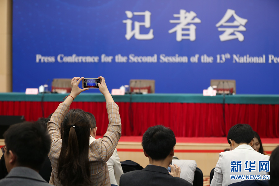 十三屆全國人大二次會議新聞中心3月8日10時在梅地亞中心新聞發(fā)布廳舉行記者會,邀請國務(wù)委員兼外交部長王毅就“中國外交政策和對外關(guān)系”相關(guān)問題回答中外記者提問。圖為記者在現(xiàn)場準(zhǔn)備。新華網(wǎng)/中國政府網(wǎng) 劉廈 攝