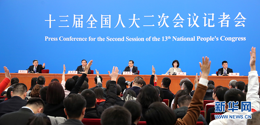 3月15日,國務(wù)院總理李克強在北京人民大會堂會見采訪十三屆全國人大二次會議的中外記者并答記者問。這是記者舉手提問。 新華社記者 殷剛 攝