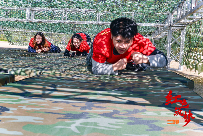 上午九時(shí),一支隊(duì)伍正合力將長(zhǎng)繩和70面國(guó)旗串聯(lián)懸掛至旗海中,讓人聯(lián)想起第一面五星紅旗在開國(guó)大典廣場(chǎng)上飄揚(yáng)的場(chǎng)景;另一支隊(duì)伍的幾位隊(duì)員正用PVC管作為連接,合力吹氣將5個(gè)氫氣球吹爆,這是在通過游戲的形式致敬1967年的第一顆氫彈爆炸成功;還有一群隊(duì)員穿著救生衣、膠鞋扛著自己的隊(duì)友穿越洪水區(qū)、獨(dú)木橋區(qū)、沼澤地區(qū),還原98 年抗洪搶險(xiǎn)、5.12抗震救災(zāi)的場(chǎng)景……