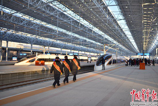 12月30日,北京至張家口高速鐵路開通運營,京張高鐵設(shè)計時速350公里,全線設(shè)北京北、清河、沙河(不辦理客運)、昌平、八達嶺長城、東花園北、懷來、下花園北、宣化北、張家口10座車站。京張高鐵是我國首條智能化高速鐵路,也是2022年冬奧會的“門戶工程”。北京北站站臺,三名站務(wù)人員走向一輛即將發(fā)車的京張高鐵列車。 實習(xí)生 宋欣然/攝