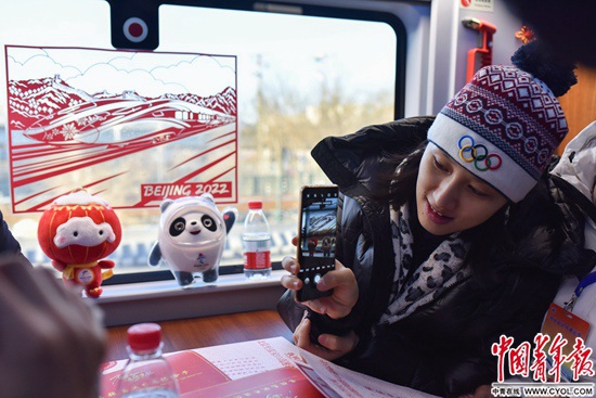 一名乘客正在拍攝2022年北京冬奧會吉祥物和車窗上的窗花。這些剪紙窗花是由張家口蔚縣剪紙藝人創(chuàng)作,包含了詹天佑畫像、京張高鐵和冰雪運動等元素。實習(xí)生 宋欣然/攝