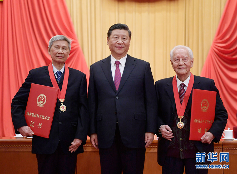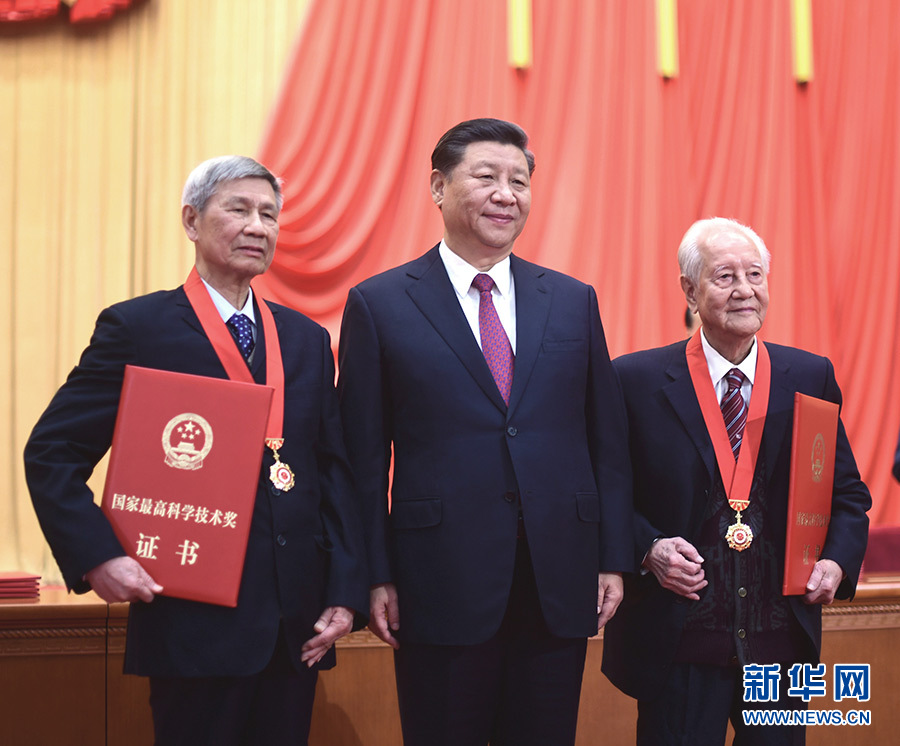 1月10日,2019年度國家科學技術獎勵大會在北京人民大會堂隆重舉行。中共中央總書記、國家主席、中央軍委主席習近平向獲得2019年度國家最高科學技術獎的原中國船舶重工集團公司第七一九研究所黃旭華院士(右)和中國科學院大氣物理研究所曾慶存院士(左)頒獎。 新華社發(fā)(盛佳鵬 攝)