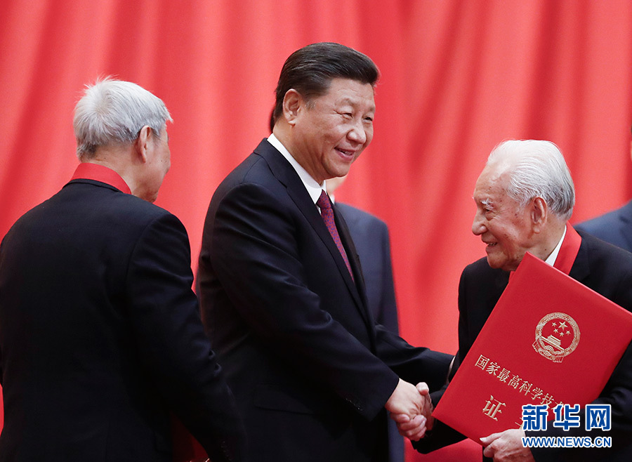上午10時30分,大會在雄壯的國歌聲中開始。在熱烈的掌聲中,中共中央總書記、國家主席、中央軍委主席習近平首先向獲得2019年度國家最高科學技術獎的原中國船舶重工集團公司第七一九研究所黃旭華院士和中國科學院大氣物理研究所曾慶存院士頒發(fā)獎章、證書,同他們熱情握手表示祝賀,并請他們到主席臺就座。隨后,習近平等黨和國家領導人同兩位最高獎獲得者一道,為獲得國家自然科學獎、國家技術發(fā)明獎、國家科學技術進步獎和中華人民共和國國際科學技術合作獎的代表頒發(fā)證書。