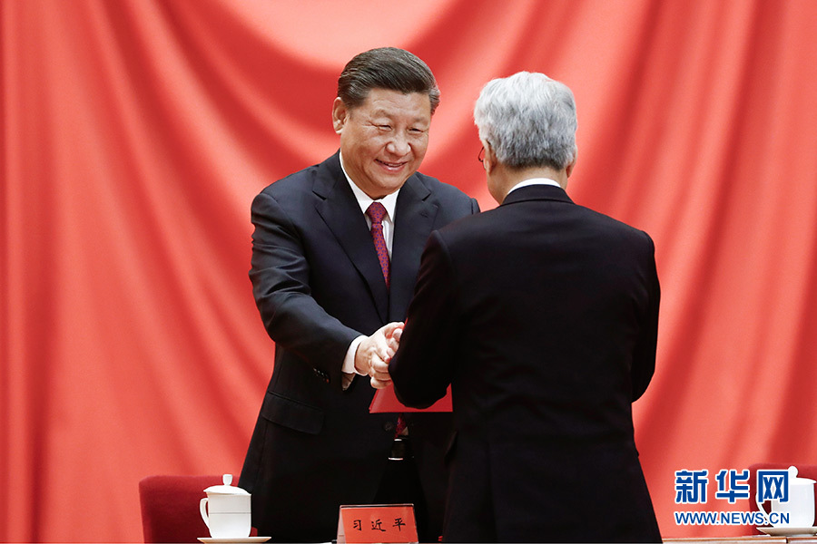 1月10日,2019年度國家科學技術獎勵大會在北京人民大會堂隆重舉行。這是習近平等黨和國家領導人同獲得2019年度國家最高科學技術獎的原中國船舶重工集團公司第七一九研究所黃旭華院士和中國科學院大氣物理研究所曾慶存院士一道,為獲得國家自然科學獎、國家技術發(fā)明獎、國家科學技術進步獎和中華人民共和國國際科學技術合作獎的代表頒發(fā)證書。 新華社記者 李學仁 攝