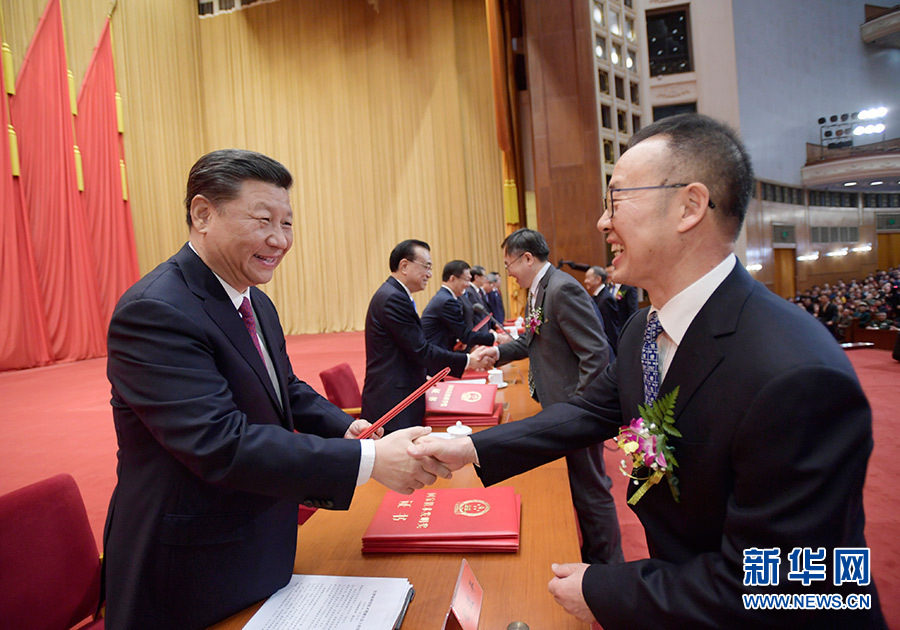 1月10日,2019年度國家科學技術獎勵大會在北京人民大會堂隆重舉行。這是中共中央總書記、國家主席、中央軍委主席習近平向獲獎代表頒發(fā)證書。 新華社發(fā)(盛佳鵬 攝)