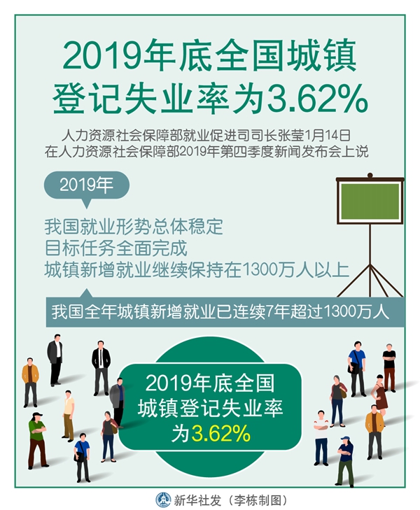 新華社北京1月14日電(記者王優(yōu)玲)人力資源社會保障部就業(yè)促進司司長張瑩14日說,2019年我國就業(yè)形勢總體穩(wěn)定,目標任務全面完成,城鎮(zhèn)新增就業(yè)繼續(xù)保持在1300萬人以上,2019年底全國城鎮(zhèn)登記失業(yè)率為3.62%。