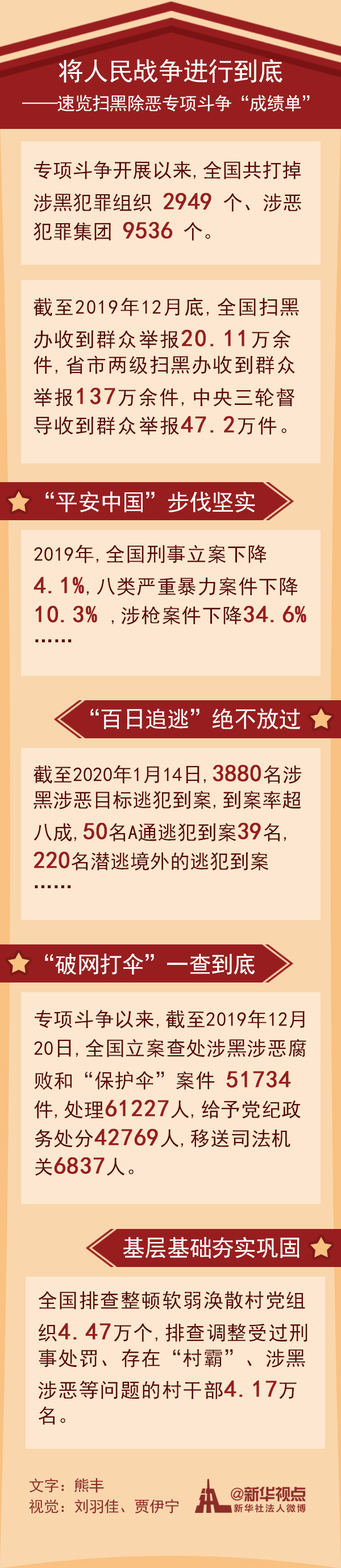 專(zhuān)項(xiàng)斗爭(zhēng)以來(lái),截至2019年12月20日,全國(guó)立案查處涉黑涉惡腐敗和“保護(hù)傘”案件51734件,處理61227人,給予黨紀(jì)政務(wù)處分42769人,移送司法機(jī)關(guān)6837人。