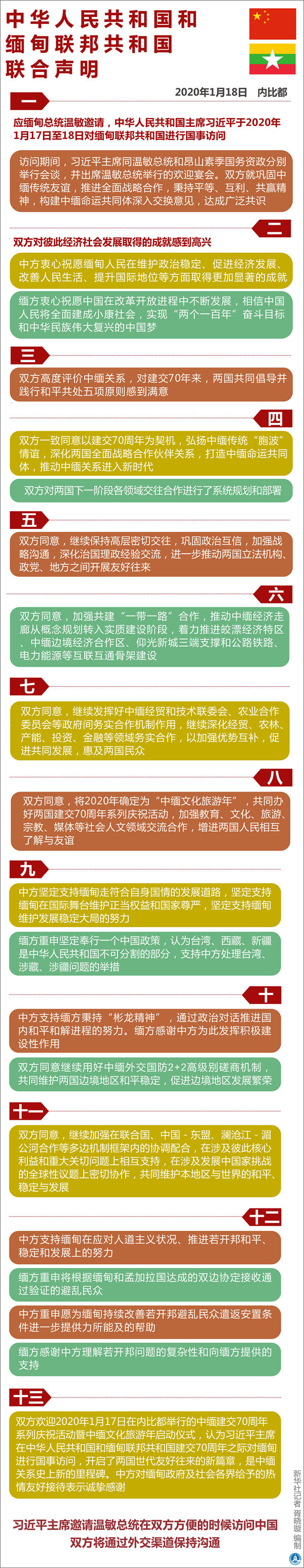 十三、雙方歡迎2020年1月17日在內(nèi)比都舉行的中緬建交70周年系列慶?;顒?dòng)暨中緬文化旅游年啟動(dòng)儀式,認(rèn)為習(xí)近平主席在中華人民共和國和緬甸聯(lián)邦共和國建交70周年之際對緬甸進(jìn)行國事訪問,開啟了兩國世代友好往來的新篇章,是中緬關(guān)系史上新的里程碑。中方對緬甸政府及社會(huì)各界給予的熱情友好接待表示誠摯感謝。
