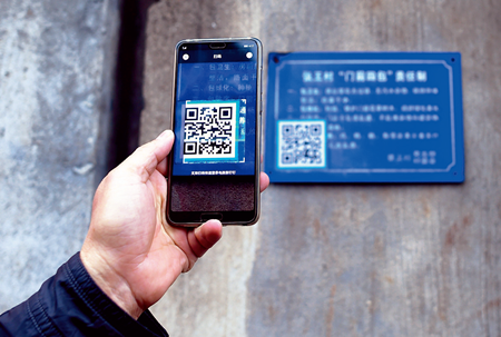 2018年10月22日,衢州市龍游縣東華街道張王村的工作人員通過“龍游通”掃描住戶門前二維碼了解信息 韓傳號攝