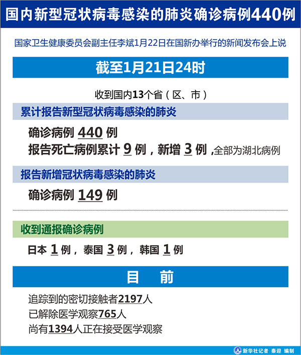 截至1月21日24時,國家衛(wèi)健委收到國內(nèi)13個?。▍^(qū)、市)累計報告新型冠狀病毒感染的肺炎確診病例440例,報告死亡病例累計9例,新增3例,全部為湖北病例。