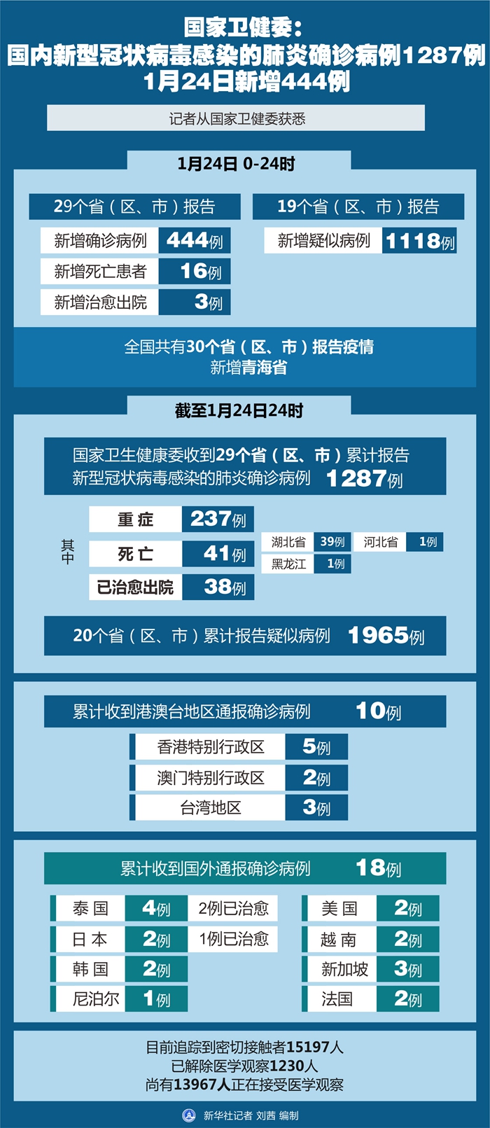 截至1月24日24時,國家衛(wèi)健委收到29個省(區(qū)、市)累計報告新型冠狀病毒感染的肺炎確診病例1287例,其中重癥237例,死亡41例(湖北省39例、河北省1例、黑龍江1例)。已治愈出院38例。20個?。▍^(qū)、市)累計報告疑似病例1965例。