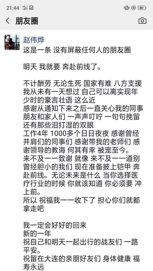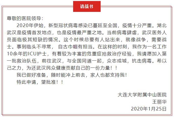 通知下發(fā)后,大連各大醫(yī)院醫(yī)護(hù)人員紛紛主動(dòng)請(qǐng)纓:“只要被需要,義無(wú)反顧,放心吧主任,我強(qiáng)壯”“主任,我也可以去武漢,等待您的派遣”“一切聽(tīng)從組織安排”“需要我們的時(shí)候到了,沒(méi)有硝煙的戰(zhàn)場(chǎng)需要我們,我自愿加入抗擊疫情的隊(duì)伍”……醫(yī)院微信群里被自愿報(bào)名聲刷屏。