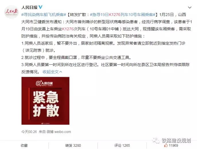 1月25日,山西大同市衛(wèi)健委發(fā)布通知:大同市首例確診的新型冠狀病毒感染患者,經(jīng)流行病學(xué)調(diào)查,該患者于1月19日由武昌上車乘坐K1276次列車(10號(hào)車廂01中鋪)抵達(dá)大同,現(xiàn)提醒該車廂乘客,需采取防護(hù)措施,并按傳染病防治有關(guān)規(guī)定,同乘人員需采取如下防護(hù)措施: 1、同乘人員返家后,暫不要外出,居家封閉隔離觀察。發(fā)現(xiàn)異常者請(qǐng)立即就近到指定發(fā)熱門診(詳見(jiàn)附表)就診。 2、就診過(guò)程中,要全程佩戴口罩,盡量不要乘坐公共交通工具。 3、同乘人員要第一時(shí)間到所在社區(qū)進(jìn)行登記。社區(qū)要第一時(shí)間向所在縣區(qū)衛(wèi)體局報(bào)告并持續(xù)跟蹤反饋情況。