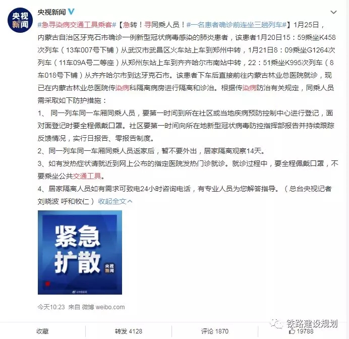 1月25日,內(nèi)蒙古自治區(qū)牙克石市確診一例新型冠狀病毒感染的肺炎患者,該患者1月20日15:59乘坐K458次列車(13車007號(hào)下鋪)從武漢市武昌區(qū)火車站上車到鄭州中轉(zhuǎn),1月21日8:09乘坐G1264次列車(11車09A號(hào)二等座)從鄭州東站上車到齊齊哈爾市南站中轉(zhuǎn),22:51乘坐K995次列車(8車018號(hào)下鋪)從齊齊哈爾市到達(dá)牙克石市。該患者下車后直接前往內(nèi)蒙古林業(yè)總醫(yī)院就診,現(xiàn)已在內(nèi)蒙古林業(yè)總醫(yī)院傳染病科隔離病房進(jìn)行隔離和診治。根據(jù)傳染病防治有關(guān)規(guī)定,同乘人員需采取如下防護(hù)措施: 1、 同一列車同一車廂同乘人員,要第一時(shí)間到所在社區(qū)或當(dāng)?shù)丶膊☆A(yù)防控制中心進(jìn)行登記,面對(duì)面登記時(shí)要全程佩戴口罩。社區(qū)要第一時(shí)間向所在地新型冠狀病毒防控指揮部報(bào)告并持續(xù)跟蹤反饋情況,實(shí)行日?qǐng)?bào)告、零報(bào)告制度。 2、同一列車同一車廂同乘人員返家后,暫不要外出,居家隔離觀察14天。 3、如有發(fā)熱癥狀請(qǐng)就近到網(wǎng)上公布的指定醫(yī)院發(fā)熱門診就診。就診過(guò)程中,要全程佩戴口罩,不要乘坐公共交通工具。