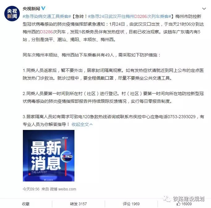 梅州市防控新型冠狀病毒感染的肺炎疫情指揮部緊急通知:1月24日,由武漢漢口出發(fā),于當(dāng)天21時(shí)06分到達(dá)梅州西的D3286次列車,發(fā)現(xiàn)1名乘務(wù)員伴有發(fā)熱癥狀,目前已收治觀察。該趟車廣東境內(nèi)有5站,分別是饒平、潮汕、揭陽(yáng)、豐順東、梅州西。同車次梅州豐順站、梅州西站下車乘客共有49人,需采取如下防護(hù)措施: 1、同乘人員返家后,暫不要外出,居家封閉隔離觀察。如有發(fā)熱癥狀請(qǐng)就近到網(wǎng)上公布的定點(diǎn)醫(yī)院發(fā)熱門診救治。就診過(guò)程中,要全程佩戴口罩,盡量不要乘坐公共交通工具。 2、同乘人員要第一時(shí)間到所在村(社區(qū))進(jìn)行登記。村(社區(qū))要第一時(shí)間向所在地防控新型冠狀病毒感染的肺炎疫情指揮部報(bào)告并持續(xù)跟蹤反饋情況,實(shí)行每日零報(bào)告制度。 3、居家隔離人員如有需求可致電120急救熱線咨詢或聯(lián)系市疾控中心應(yīng)急電話0753-2393029,有專業(yè)人員為你解答指導(dǎo)!