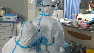 穿上隔離服的醫(yī)護(hù)人員只能露出一雙眼睛,誰也認(rèn)不出對方,于是他們進(jìn)入隔離區(qū)的第一件事,就是相互在隔離服上寫下對方的名字或者外號,有時還會藝術(shù)創(chuàng)作一下,這成了隔離病房里“神秘的儀式”。