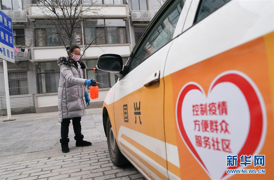 1月27日,武漢市武昌區(qū)糧道街曇華林社區(qū)干部在給配給社區(qū)使用的出租車消毒。新華社記者 程敏 攝