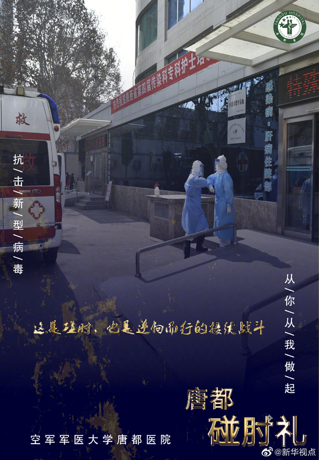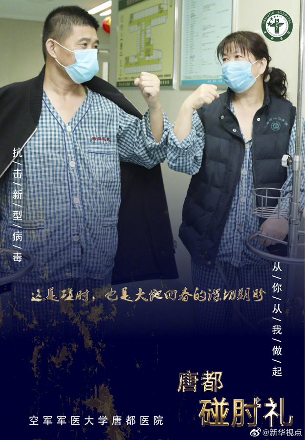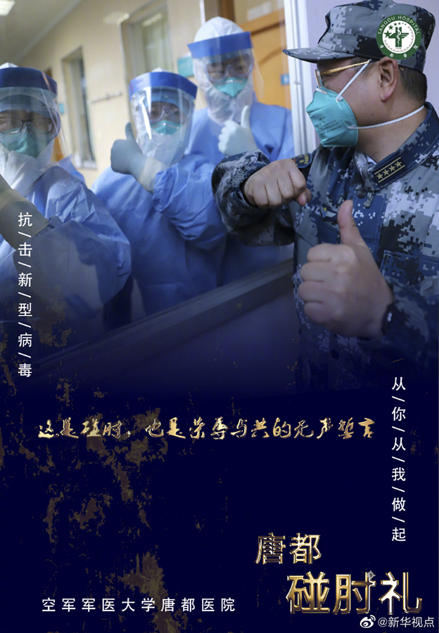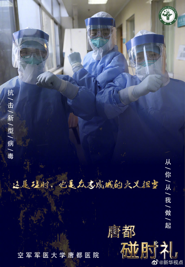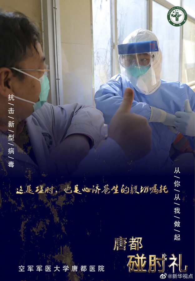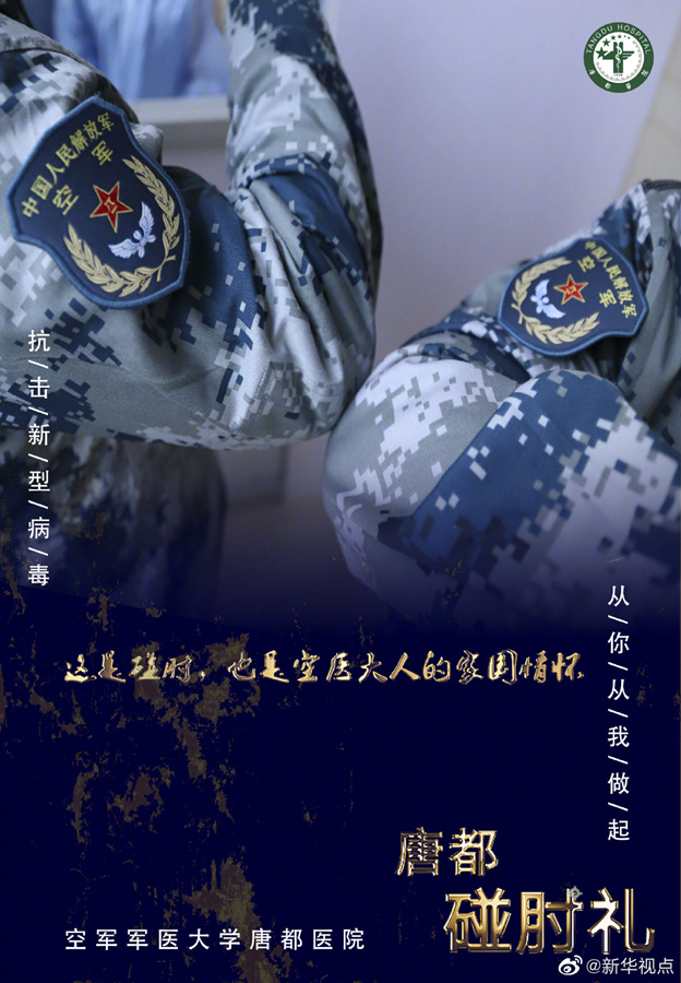 疫情當(dāng)前,空軍軍醫(yī)大學(xué)唐都醫(yī)院的醫(yī)護(hù)人員在抗擊疫情的同時,用新的肢體語言——“碰肘禮”,相互問候,相互加油。肘碰肘,心連心,萬眾一心,定能戰(zhàn)勝病毒。(文字藺娟;圖片由空軍軍醫(yī)大學(xué)唐都醫(yī)院提供) ????