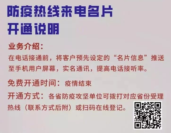 中國電信免費為各地防疫熱線提供來電名片服務,保證關鍵時期的電話第一時間快速接通。