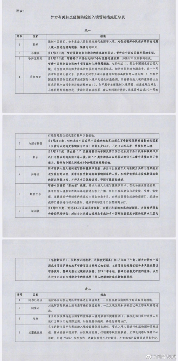 據(jù)外交部“領事直通車”微信公眾號消息,為防控新型冠狀病毒感染的肺炎疫情,部分國家已在口岸采取了相應的入境管制措施(詳見附表,供參考)。外交部領事司提醒中國公民根據(jù)自身健康狀況合理安排出行,詳細了解并遵守目的地國有關入境規(guī)定。外交部全球領事保護與服務應急熱線:+86-10-12308,+86-10-59913991。(記者成欣)?