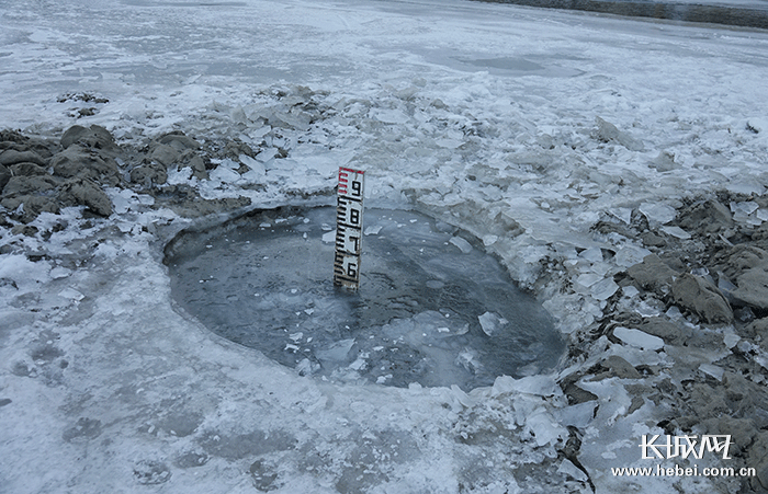 在灤河水文測量點被凍住的水尺。記者 王林紅 攝
