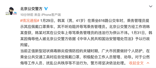 1月31日,韓某因侮辱他人被北京公交警方依據(jù)《中華人民共和國(guó)治安管理處罰法》予以行政拘留。當(dāng)前正值新型冠狀病毒肺炎疫情防控的關(guān)鍵時(shí)期,廣大市民要做好個(gè)人防護(hù),在乘坐公共交通工具時(shí)應(yīng)自覺(jué)佩戴口罩,積極配合工作人員管理、勸導(dǎo)。對(duì)于公然侮辱工作人員、擾亂公共秩序等不法行為,警方將堅(jiān)決依法處理。