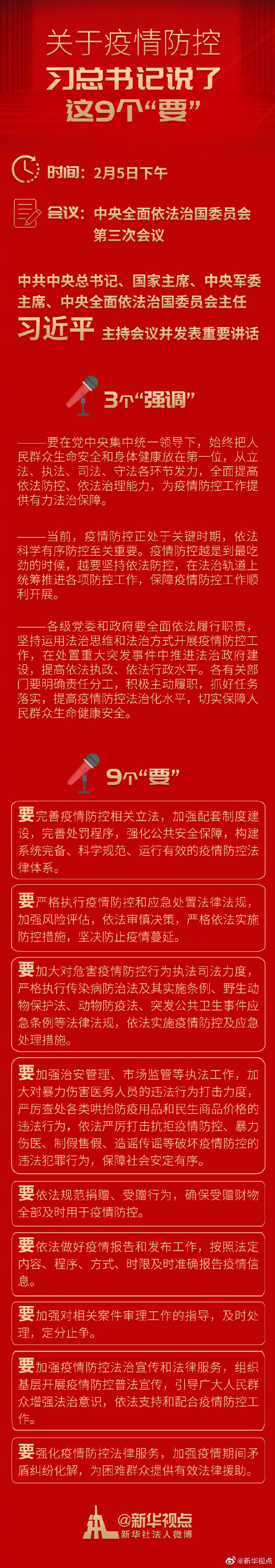 2月5日下午,中共中央總書記、國家主席、中央軍委主席、中央全面依法治國委員會主任習(xí)近平主持召開中央全面依法治國委員會第三次會議強調(diào),全面提高依法防控依法治理能力,為疫情防控提供有力法治保障。