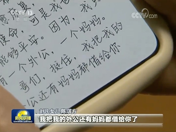劉凡女兒 陳琪方:在我的世界里面,我的媽媽和我的外公是很行的。我把他們借給患者,他們能頂起我這個家,那同樣就可以頂起你們患者的這片天。我發(fā)了這篇文章以后,很多人說加油、加油,那一瞬間覺得,這個年挺暖和的。