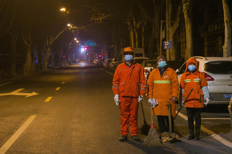 2月3日清晨,三位堅守崗位的環(huán)衛(wèi)工人。