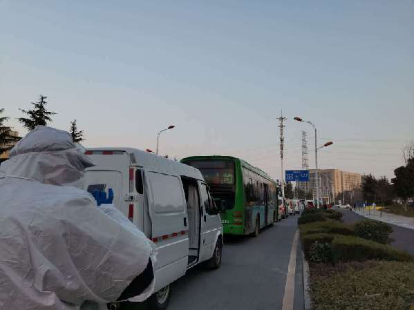 各個(gè)街道轉(zhuǎn)運(yùn)病人的車輛排成長(zhǎng)龍