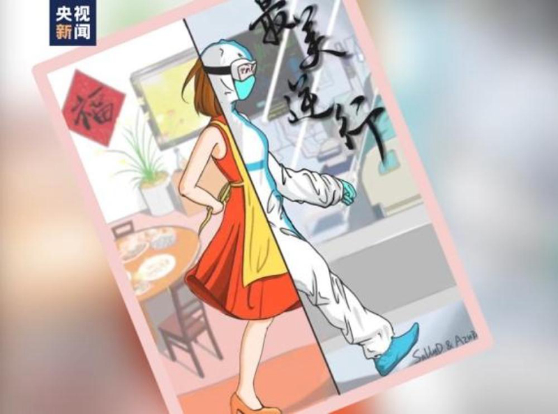 設(shè)計(jì)師董思喬的母親,是北京大學(xué)人民醫(yī)院的一名醫(yī)務(wù)工作者。在董思喬七歲那年,正逢非典暴發(fā),她的母親堅(jiān)守崗位留在醫(yī)院救治患者。十七年后,新冠肺炎來(lái)襲,她看到很多醫(yī)務(wù)工作者也像當(dāng)年她的母親一樣在最危險(xiǎn)的地方戰(zhàn)斗,義無(wú)反顧,馳援武漢。于是,她拿出畫筆畫出她心中醫(yī)務(wù)工作者們最美的樣子:“身后,是飄香的飯菜,是溫馨的家;面前,是防疫一線,是需要救治的患者。逆行者們,愿你們平安歸來(lái)。”