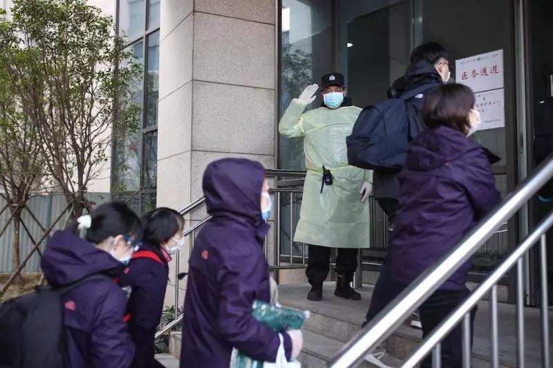 (醫(yī)療隊(duì)員拿著自己的衣物等待進(jìn)入醫(yī)院工作區(qū))
