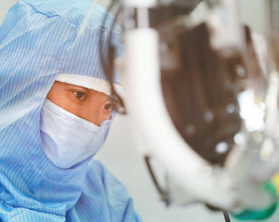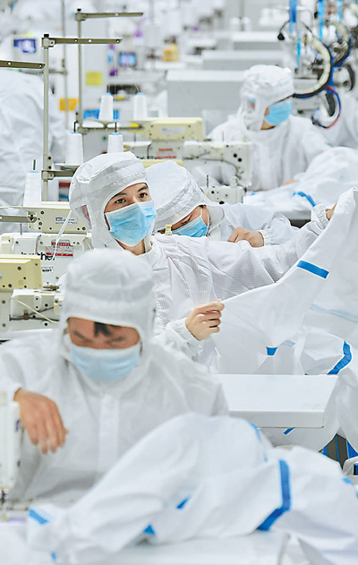 2月4日,福建晉江市一間無菌實驗室,工人正在加緊生產(chǎn)防護(hù)服,為防疫一線提供物資保障。新華社記者 姜克紅攝