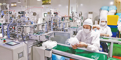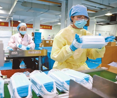 2月14日,在浙江長興縣和平鎮(zhèn)一家無紡布制品公司口罩生產(chǎn)車間,員工們在整理口罩。許 旭攝(人民視覺)