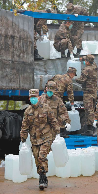 2月10日,河北邯鄲市一家愛心組織為火神山醫(yī)院捐贈的百噸醫(yī)用消毒原液運抵武漢并予交接,圖為醫(yī)療隊隊員在快速搬運醫(yī)療物資。范顯海攝(新華社發(fā))