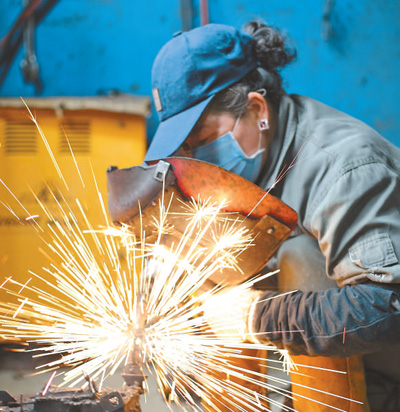 2月13日,江西瑞昌市一家公司的生產(chǎn)車間內(nèi),工人正在趕制負(fù)壓救護(hù)車沖壓配件。魏東升攝(影像中國)