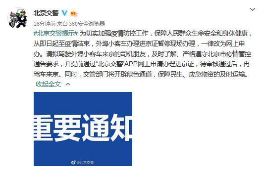 警方提醒,請擬駕駛外埠小客車來京的司機(jī)朋友,及時(shí)了解、嚴(yán)格遵守北京市疫情管控通告要求,并提前通過“北京交警”APP網(wǎng)上申請辦理進(jìn)京證,待審核通過后,再駕車來京。同時(shí),交管部門將開辟綠色通道,保障民生、應(yīng)急物資的及時(shí)運(yùn)輸。