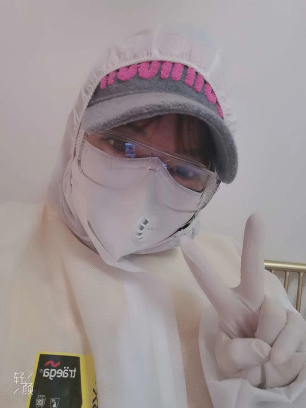 我出去心理壓力也很大,所以我回來進(jìn)門之前,消毒工作從頭到腳,到鞋底都不放過。防護(hù)服那些在樓下脫下,拿個塑料袋裝起來丟到垃圾桶。站在門外噴消毒液,我老公拿著“槍”對著我噴,感覺我的呼吸道都被消毒了。